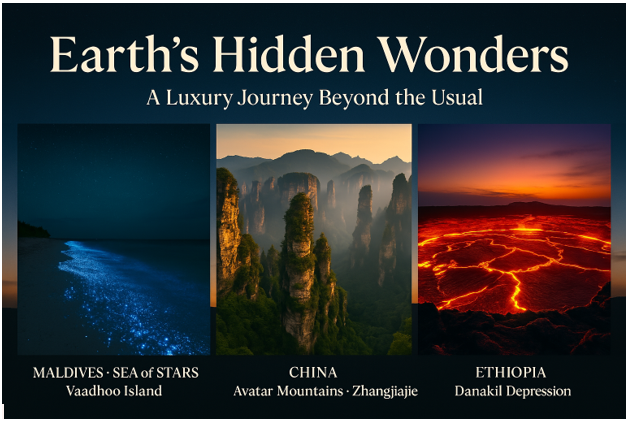 Step beyond the ordinary and into three of the most breathtaking, dreamlike environments on Earth. From glowing bioluminescent shores in the Maldives to the towering stone pillars of Zhangjiajie and the fiery alien terrain of Ethiopia’s Danakil Depression, this curated experience is designed for travelers who crave the truly extraordinary.