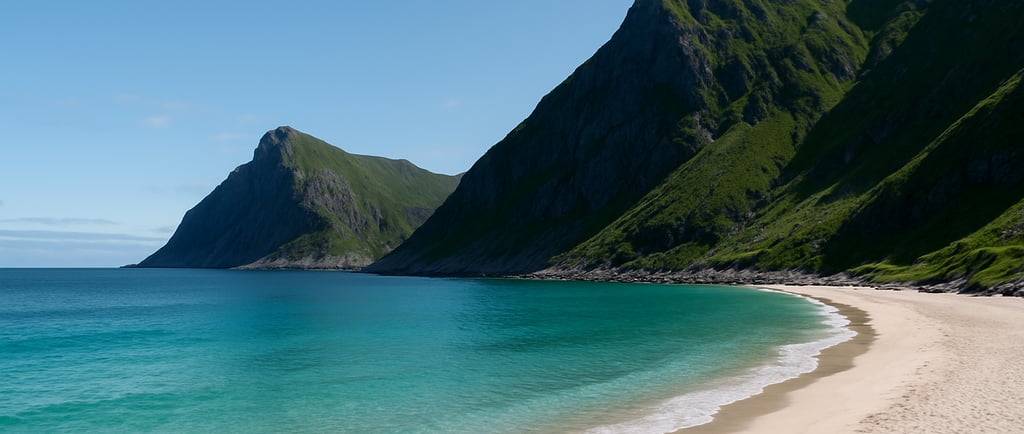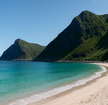 Despite its northern location, Haukland Beach feels almost tropical in appearance during summer months. The midnight sun creates endless daylight, bathing the landscape in a soft golden glow and allowing visitors to hike, swim, and explore at any hour.